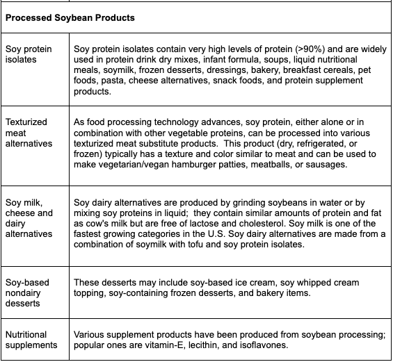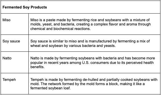 In the U.S., soybean consumption as food in the U.S. is still low compared to Asian countries, but it is growing due to increased interest in plant-based diets and other environmental reasons. Besides whole soybean products, other derivatives are available (Table 1) including fermented products which are high in probiotic bacteria and processed products widely used in food processing.